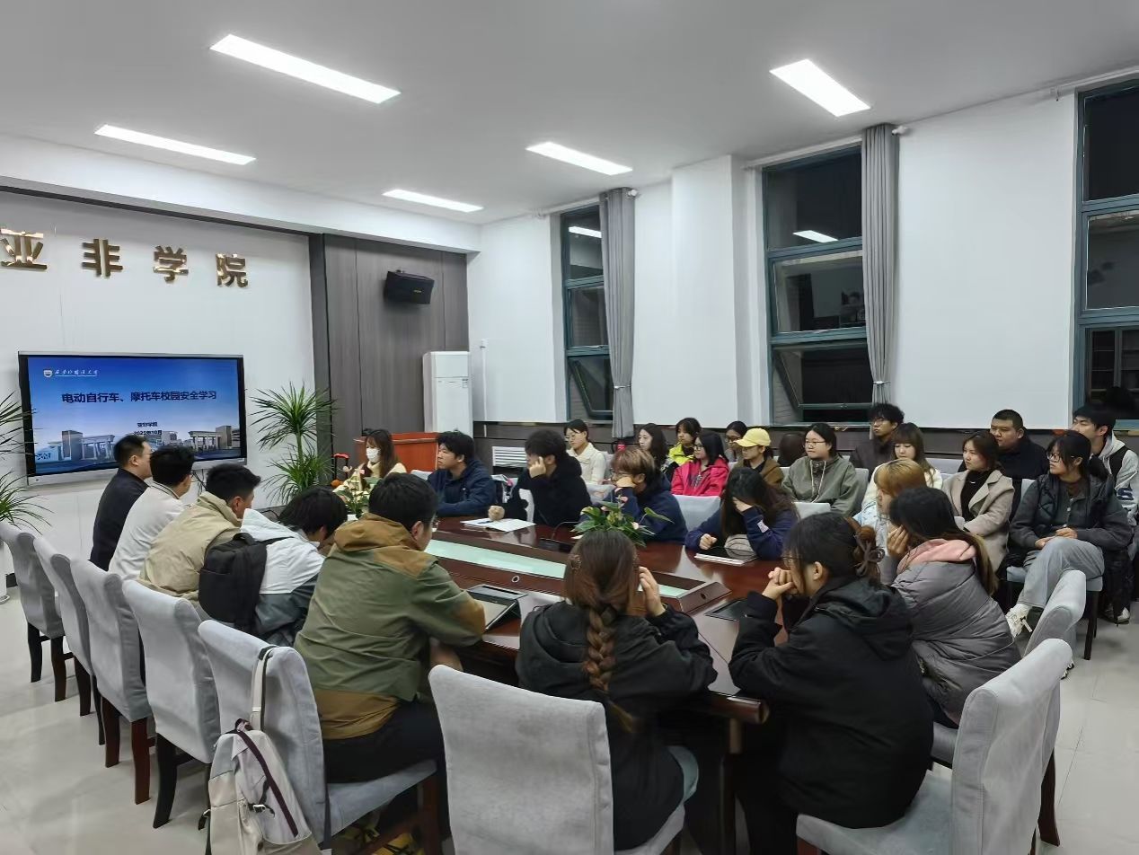 为加强校园电动自行车与摩托车管理,提升学生校园交通安全意识,营造安全文明的校园环境,10月20日下午,亚非学院举办电动自行车与摩托车安全教育学习活动。本次活动面向学院内拥有校园电动自行车与摩托车的同学,旨在通过安全知识学习,筑牢校园交通安全防线。